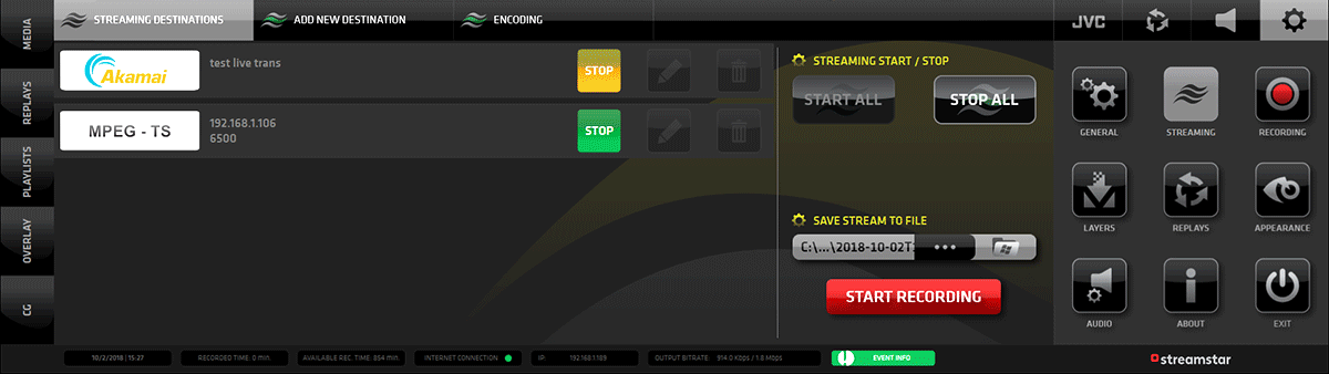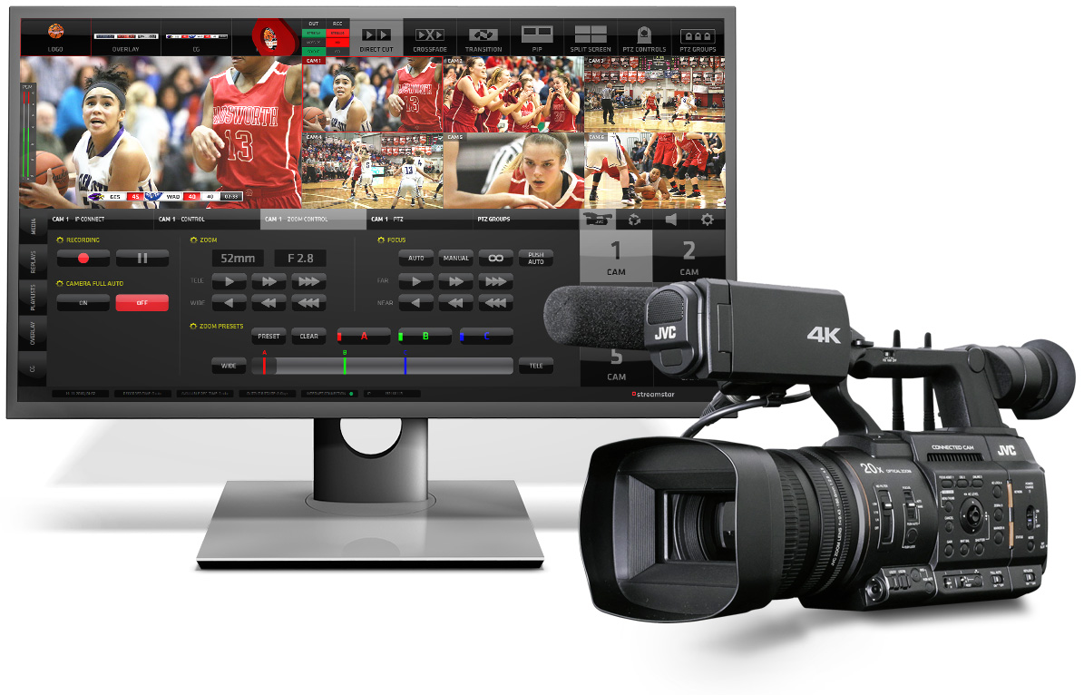 通过IP直接从Streamstar远程控制多达8台JVC ProHD流式便携式摄像机。